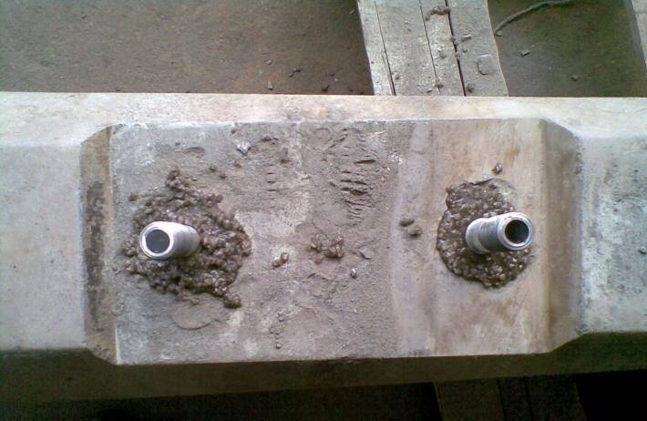 1.放置錨固架:用刮漿棒(圓頭)頂住錨固架底部,并與預(yù)留孔成45度,將錨固架置入孔內(nèi)。錨固架定位板開口部位朝向軌枕?yè)跫,以便于放置擋板座?/span>
